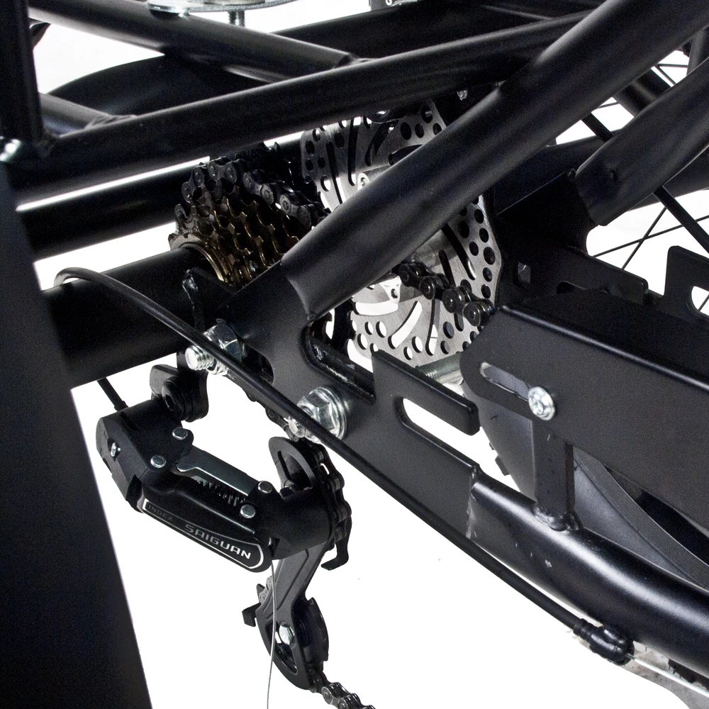Современный трицикл представлен стильным заметным дизайном. Вызывает удивление и  зависть со стороны других райдеров. Основная конструкция техники изготовлена из долговечного прочного металла, не деформирующегося при максимальной нагрузке 180 кг. Тормозная система – дисковая, механическая, гарантирует своевременное торможение и безопасность передвижения пользователя.